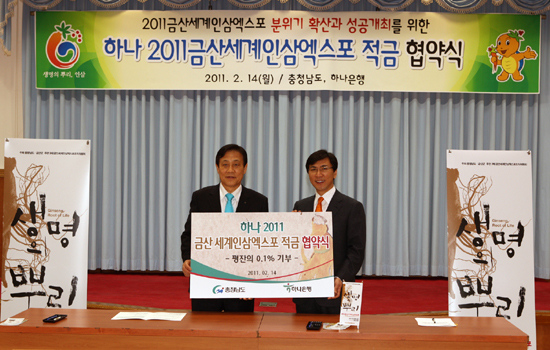충남도는 하나은행과 '2011금산세계인삼엑스포' 의 전국적인 분위기 확산과 성공개최에 기여하기 위한 목적으로 '하나 2011금산세계인삼엑스포 적금' 상품을 개발, 시판에 나서기로 했다.