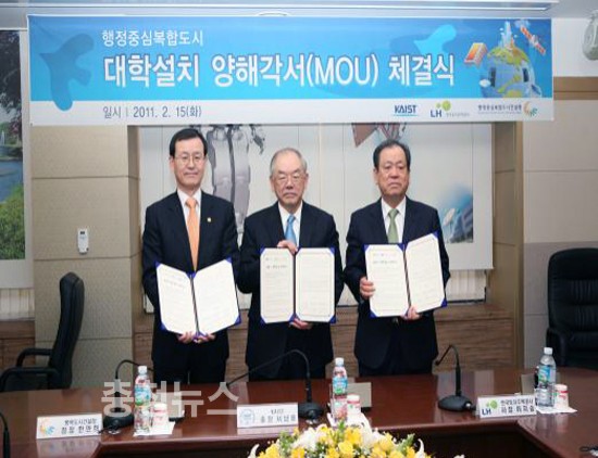 행정중심복합도시건설청(청장 한만희, 이하 건설청)과 한국과학기술원(총장 서남표, 이하 KAIST), 한국토지주택공사(사장 이지송)는 세종시에 대학설립을 위한 양해각서(MOU)를 15일 KAIST 회의실에서 체결했다.
