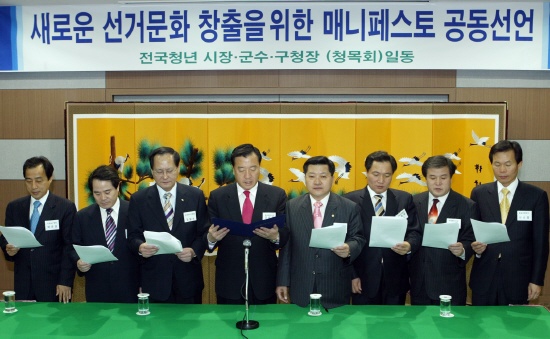 전국 청년시장군수구청장회(일명 청목회)는 3월3일 오후 3시 30분 유성레전드호텔에서 5.31지방선거에서는 인기위주의 추상적 공약이 아닌 실현가능한 정책공약의 선거풍토를 조성하기 위해 매니페스토 운동에 솔선 참여하기로 하는 공동선언을 했다.