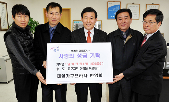 대전시 중구(구청장 박용갑) 오류동에 소재한 제일가구프라자 번영회(회장 김관구)는 16일 어려운 이웃을 돕기 위해 개최한 가구 바자회 수익금 100만원을 중구에 기탁했다.