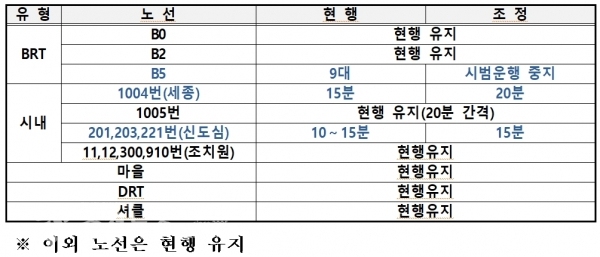 이에 시는 노선별로 ▲시범운행중인 B5 잠정 운행중단 ▲1004번 현행 15분 간격에서 20분 간격으로 ▲신도심 내 201·203·221번은 현행 10분 간격에서 15분으로 조정하고, 이외 노선은 현행대로 유지한다.