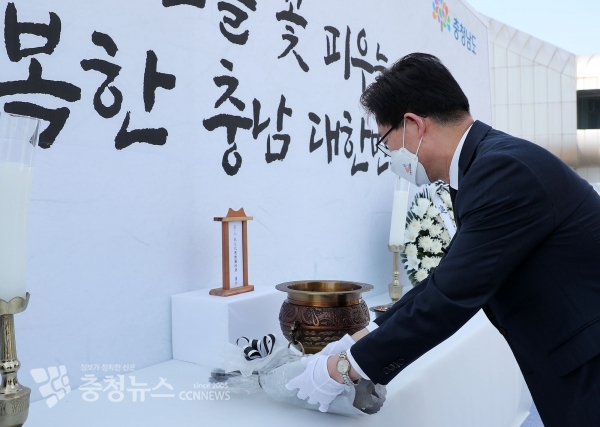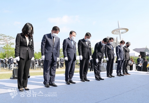 양승조 지사와 5.18 민주유공자, 기관·단체 대표 등이 참석한 가운데 연 이날 행사는 ‘민주, 평화, 인권을 꽃피우는 더 행복한 충남 대한민국의 중심’을 주제로 진행했다.