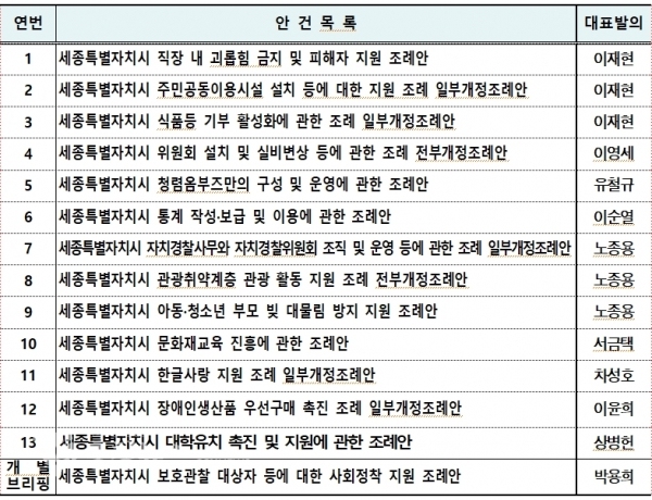 시 행정의 투명성ㆍ공정성을 제고할 수 있도록 청렴위반신고센터의 설치·운영에 대한 사항 등을 규정한 '세종특별자치시 청렴옴부즈만의 구성 및 운영에 관한 조례안'을 대표 발의 했다.