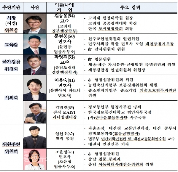 ▲김상봉(54) 고려대 정부행정학부 교수(시장 지명) ▲김영길(63) 前 KAIST 리더십센터장(의회 추천) ▲문현웅(50) 문현웅법률사무소 변호사(교육감 추천) ▲이용숙(41, 여) 유앤아이 파트너 변호사(의회 추천) ▲임선호(62) 前 총경(위원추천위 추천) ▲조윤성(45, 여) 조윤성 법률사무소 변호사(위원추천위 추천) 등 7명이다.