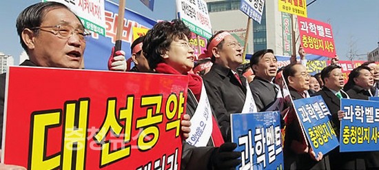 이어 "이것을 지금 여러 군데로 쪼개려고 한다. 대구.경북, 전남.광주, 경기.과천에서 끌어가려고 한다. 공공연하게 세 네 군데로 전국적으로 벨트를 만들자는 이야기도 나온다"고 말한 후 "이렇게 되면 과학비즈니스벨트는 온 데 간 데 없이 되는 것이다"고 주장했다.