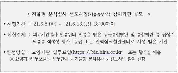 건강보험심사평가원(원장 김선민, 이하 ‘심사평가원’)은 뇌졸중 영역 「자율형 분석심사 선도사업」참여 의료기관을 8일부터 18일까지 모집한다.