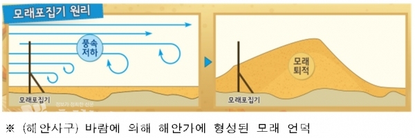 모래포집기는 대나무를 엮어 만든 약 1.2m 높이의 울타리로 해안가에 갈지자 형태로 설치해 두면 바람에 날려온 모래가 걸려 그 자리에 쌓이게 된다.