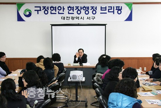 대전광역시 서구(청장 박환용)는 2011년 연두방문을 생략하고 3월부터 부구청장 주재로 동주민센터를 직접 찾아가 구정 역점시책과 주요현안사업을 설명하는 구정현안 '현장방문 브리핑제'를 실시하고 있다.