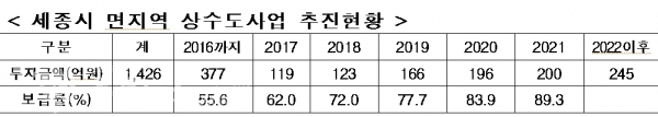 세종특별자치시(시장 이춘희)가 시민들에게 맑고 깨끗한 수돗물을 공급하고 지역 간 상수도 공급 불균형 해소를 위해 상수도 기반시설 확충사업에 박차를 가하고 있다.
