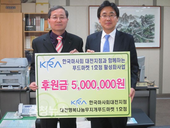 푸드마켓1호점과 한국마사회 대전지점은 16일 ‘푸드마켓 1호점 활성화사업’으로 대전행복나눔무지개푸드마켓 1호점에 후원금 5백만원 기탁증서 전달식을 가졌다.