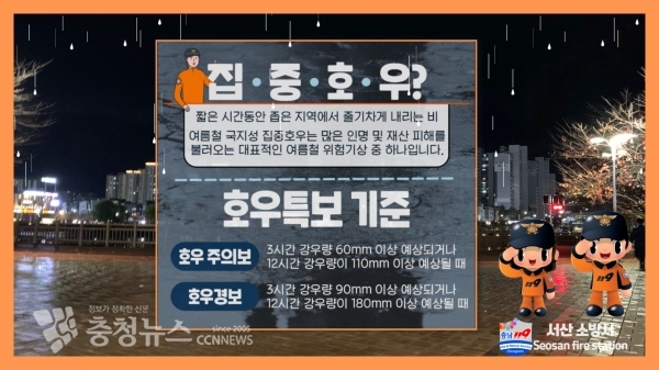 서산소방서 관계자는 12일 “장마철 재난 및 안전사고로 인한 피해를 최소화하기 위해 시민들의 적극적인 관심과 재난유형별 행동요령을 사전에 숙지하시기 바란다"고 전했다.