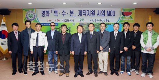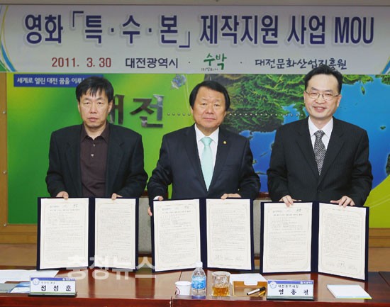 시에 따르면 30일 오전 시청 중회의실에서 염홍철 시장과 (주)영화사 수박 정성훈, 신수범 공동대표를 비롯해 강병호 대전문화산업진흥원장, 배우 정진영, 성동일, 주원 등이 참석한 가운데 영화‘특별수사본부’제작지원을 위한 상호 업무협약(MOU)을 체결했다.