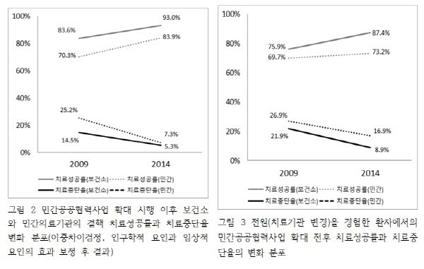 치료성공률과 치료중단율에 영향을 미칠 수 있는 다양한 요인의 효과를 보정하고도, 같은 기간 동안 치료성공률은 보건소와 비교해 민간의료기관에서 약 4.1% 더 빠르게 증가하였고, 치료중단율은 약 8.7% 더 감소하였다(그림 1).