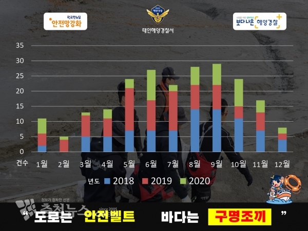 태안해경에 따르면, 지난 3년간 관내 연안사고 전체 222건 가운데 47.7%에 해당하는 106건이 6~9월 여름철에 집중 발생했으며, 같은 기간 사망사건도 전체 20건 중 12건으로 60%로 높게 나타났다.