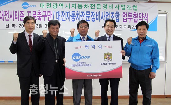 대전지역 자동차정비업체조합 “카포스(CARPOS)”가 대전시티즌과 함께 축구특별시 부활을 위한 동반자역을 자청했다. 대전자동차전문정비사업조합 강명근 이사장과 대전시티즌 김윤식 사장은 지난 31일 공동마케팅에 관한 업무협조 협약식을 가지고 축구특별시 부활을 위해 적극 협조할 것을 약속했다.