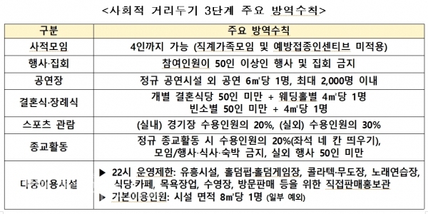 연장된 거리두기 3단계에서 5인 이상 사적모임의 경우 직계가족, 예방접종 완료자 등 각종 예외사항은 인정하지 않는다.