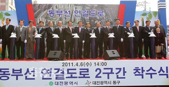 한현택 청장은 “오늘은 동구민의 30년 숙원사업인 동부선 연결도로의 첫 삽을 뜨는 날”이라며 “염홍철 대전시장, 임영호 국회의원과 함께 모든 주민이 한마음으로 동부선 연결도로 조기개통에 노력하자”고 말했다.