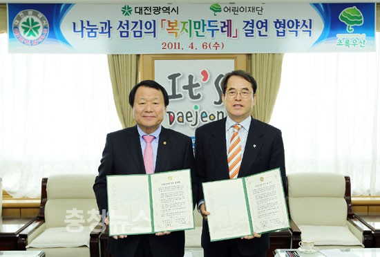 대전시는 6일 시청 사랑방에서 염홍철 대전시장을 비롯해 어린이재단회장(이제훈)등 관계자가 참석한 가운데 복지만두레 ‘love together’ 사업추진 협약을 체결했다.