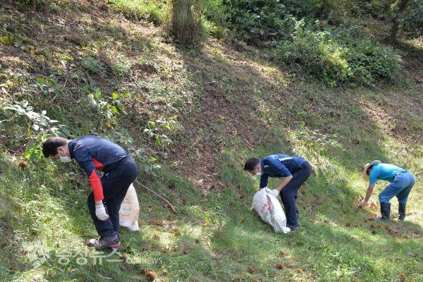 이날 일손돕기는 코로나 2차 백신접종을 완료한 5개 가업 대표 등이 참여한 가운데 약 3시간 동안 밤산을 헤쳐나가며 알밤을 가득 주우며 청명한 가을을 즐겼다.