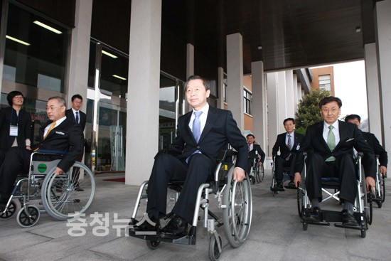 ▲ 김종성 충남교육감이 휠체어를 타고 장애체험을 하고 있다.
