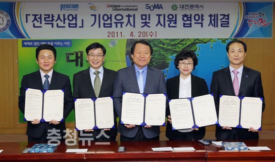 대전시는 20일 시청 중회의실에서 염홍철 대전시장을 비롯해 윤상현 (주)프로컴시스템 대표, 유재섭 (주)윌럭스 대표, 심태흥 유니크인터네셔널(주) 대표, 이인경 (주)소마 대표 등 관계자들이 참석한 가운데 대전이전을 위한 업무협약을 체결했다고 밝혔다.