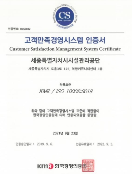 세종특별자치시시설관리공단(이사장 계용준, 이하 공단)은 ISO10002(고객만족경영시스템) 인증 유지를 위한 사후심사에서 적합 판정을 받았다.
