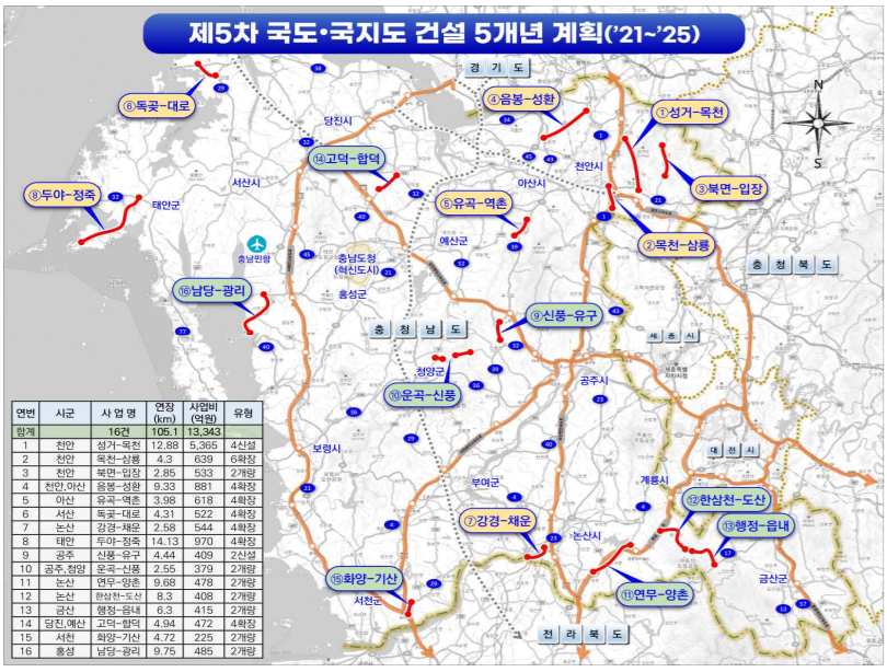 정부의 ‘제5차 국도·국지도 건설 5개년 계획(2021-2025)’에 충남도 내 예비타당성조사(예타) 비대상 8개 사업 3200억여 원이 반영된 것으로 나타났다.