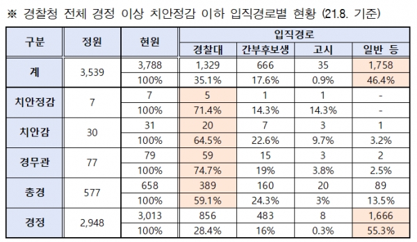 총경 이상 계급의 경우, 전체 692명 중 474명으로 68.5%를 차지해, 일반 출신의 13.3%에 비해 4배 이상 많은 것으로 나타나, 경찰대 출신의 독점이 심각한 수준인 것으로 드러났다.