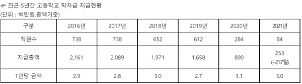 또한 무상교육 도입 당시 수업료‧입학금‧학교운영지원비 등 고교 학비가 1인당 160만원 수준이었던 것과 비교해, KBS는 이를 훨씬 웃도는 1인당 290만원 수준으로 학비를 지원한 것으로 나타났다.