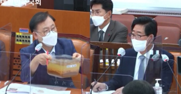 또 댐 인근 폐광지역에서 나오는 환경 문제도 짚었다. 이 의원은 보령댐 인근에서 직접 담아온 물을 보여주며 “댐에서 3km 떨어진 성주산에서 흘러나온 물인데, 녹물과 황토로 덮여 있다. 이게 보령댐으로 가는 것”이라며 “수량과 수질 모두 중장기 대책을 만들어 관리해야 한다”고 주장했다.