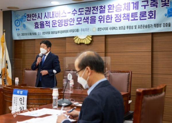 천안시의회(의장 황천순) 시내버스 보조금 투명성 및 표준운송원가 적정성 검증을 위한 특별위원회는 12일 천안시의회 복지문화위원회 회의실에서 ‘천안시 시내버스-수도권전철 환승 구축 방안 모색’을 주제로 토론회를 개최했다.