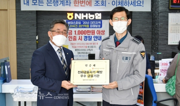 대전서부경찰서는 14일 이른바 보이스피싱을 막는 데 큰 공을 세운 서대전농협 서도마지점을 ‘전화금융사기 예방 우수 금융기관’으로 선정하고 인증패 및 경찰서장 감사장을 수여했다.