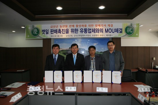 충남 금산군(군수 박동철)은 3일 군청에서 박동철 금산군수와 지역농협장, 깻잎작목회장 등 관련기관장 20여명이 참여한 가운데 금산깻잎 판매촉진 및 깻잎 향토산업 활성화를 위해 금산깻잎 향토사업단과 유통업체인 농업법인 유팜스 및 제이팜스와 MOU를 체결했다고 밝혔다.