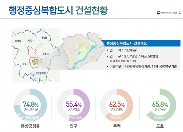 국토 균형발전과 국가 경쟁력 강화를 위해 2007년 착공한 행정중심복합도시는 73㎢의 예정지역 내 인구 50만명의 자족도시 건설을 목표로 현재 75% 공정률을 보이고 있다.