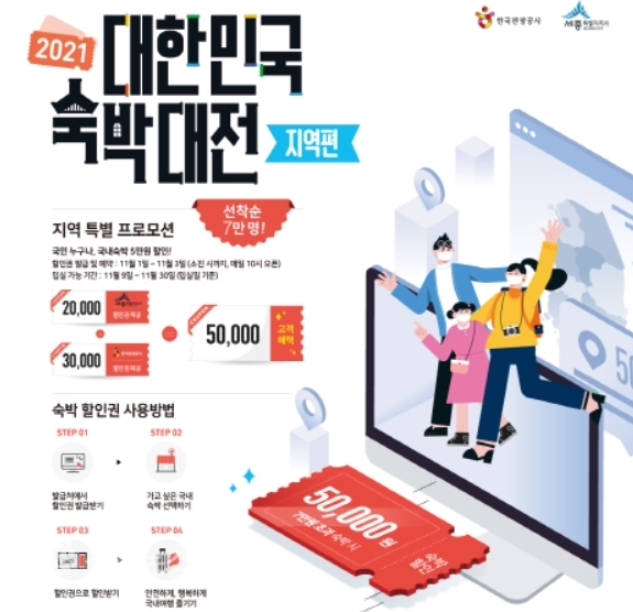 세종시에서는 국내 대형 온라인여행사 9곳에서 베스트웨스턴 플러스 호텔, 목인동펜션, 스카이모텔 등 세종시 소재 숙박업소 3곳에서 7만 원 초과 상품 예약시 5만 원을 할인하는 특별할인쿠폰을 지급한다.