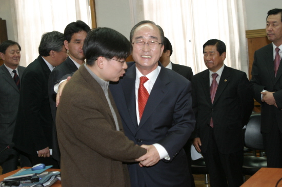 ▲ 기자회견을 마치고 심대평도지사가 관계자를 격려하며 환하게 웃고 있다.