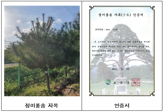 이 자목은 충북 보은군에서 2013년 9월 문화재청의 허가를 받아 정이품송의 종자를 채취, 발아시켜 길러온 나무로 유전자 검사를 완료하였으며, 수령 7년인 2014년생 나무이다.