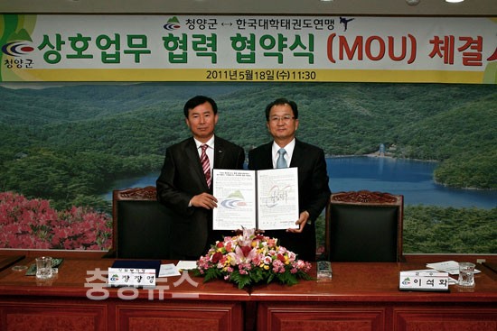 ▲ 이석화 청양군수가 한국대학태권도연맹과 MOU를 체결했다.