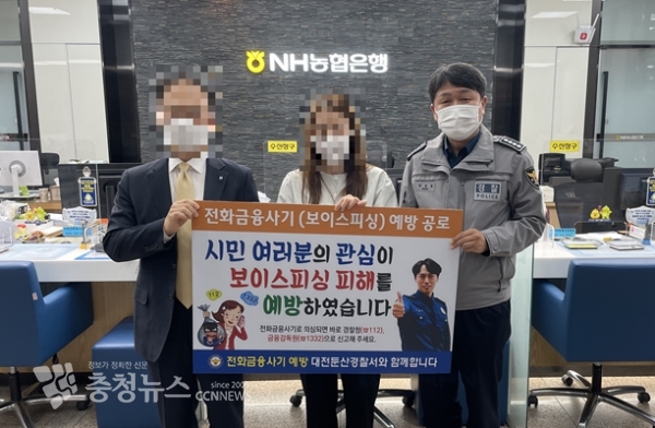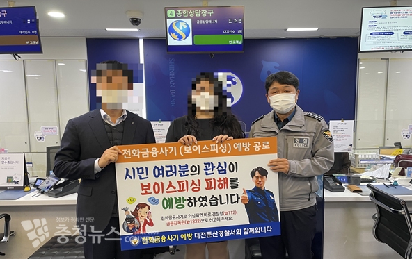 [충청뉴스 김윤아 기자] 대전둔산경찰서(서장 맹병렬)는 11일 보이스피싱 피해를 예방한 NH농협은행 ○○센터 A 계장과 신한은행 ○○지점 B 행원에게 신고보상금과 감사장을 수여했다.