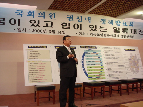 대전시장출마를 선언한 권선택 의원이 14일 기독교봉사회관에서 '대전미래 청사진11대 프로젝트'를 제시하며 본격적인 정책선거를 시작했다.