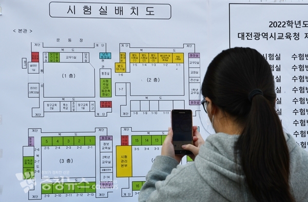 수능을 하루 앞둔 17일 예비소집일에 한 수험생이 시험실 배치도를 촬영하고 있다. / 충청뉴스 이성현 기자