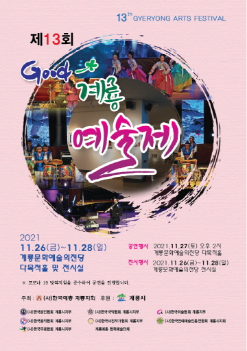 [충청뉴스 계룡 = 조홍기 기자] 계룡시(시장 최홍묵)는 계룡시 문화예술인들의 축제 한마당이자 화합과 교류의 장인 ‘제13회 Good 계룡예술제(이하 예술제)’가 계룡문화예술의전당 전시실과 다목적홀에서 11월 26일부터 28일까지 3일간 펼쳐진다고 밝혔다.