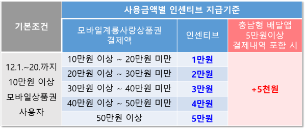 시는 이에 그치지 않고 모바일 계룡사랑상품권 가맹점에서 사업기간(12월 1일∼20일) 중 10만원 이상 모바일 상품권으로 결제한 자에 한해 ‘충남형 배달앱 소문난 샵’에서 5만원 이상 모바일 계룡사랑상품권으로 결제한 내역이 포함되어 있는 경우에는 비대면 소비촉진 인센티브 5천원을 추가 지급할 예정이다.