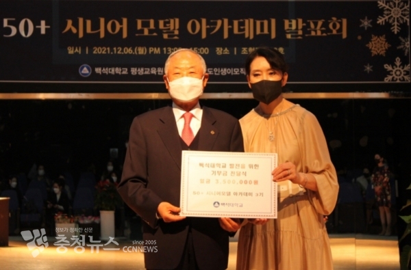 장택현 대학혁신위원장은 “50+시니어 모델과정을 통해 신중년의 소통, 희망, 행복의 시대적 가치를 공유하는 계기가 되길 바란다며 이 기부금은 대학의 발전을 위해 소중히 사용하겠다”고 말했다.