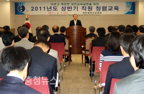 대전시교육청(교육감 김신호)은 1일 전 직원 300여명이 참석한 가운데 시교육청 회의실에서 바르고 깨끗한 대전교육실현을 위한 2011년도 상반기 반부패 청렴교육을 실시했다.