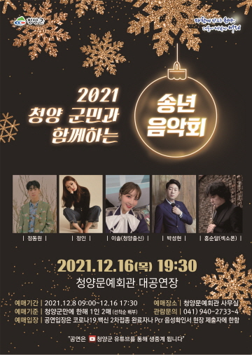 [충청뉴스 청양 = 조홍기 기자] 청양군(군수 김돈곤)이 다사다난한 해를 마감하고 희망찬 새해를 맞이하기 위해 오는 16일 오후 7시 30분 청양문화예술회관 대공연장에서 군민과 함께하는 송년 음악회를 개최한다고 8일 밝혔다.