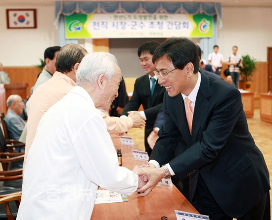 ▲ 안희정 도지사가 전직 시장·군수 간담회에 참석해 악수를 하고 있다.