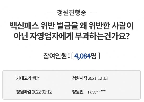 청와대 국민청원 게시판에 지난 13일 '백신패스 위반 과태료를 왜 위반한 사람이 아닌 자영업자에게 부과하는 건가요?' 라는 제목의 청원이 게재됐다. 자신을 자영업자라고 소개한 청원인 A씨는 "현재 정부에서 추진하고 있는 백신패스에 문제가 있다"고 말했다.