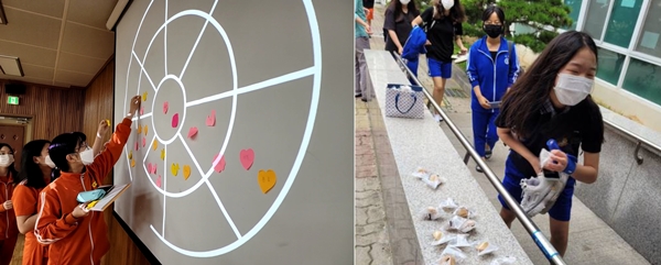 5월에는 도서관에서 도서 대출을 한 학생들에게 추첨을 통해 선생님 추천도서를 증정하는 ‘사제드림 독서 행사’를 개최했다. 행복의 가치를 담은 선생님 추천도서를 공유하는 활동으로 즐거운 독서 활동의 여건을 조성하고, 혁신학교의 핵심가치인 행복의 의미를 학생들과 나누는 시간을 마련했다. 특히 온라인 플랫폼을 적극 활용해 시간과 공간의 제약에서 벗어나 소통과 공유의 가치를 이어가도록 노력했다.