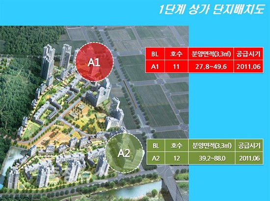 공급대상 상가는 23호로 A1블록 11호(분양면적 91.7~163.7㎡), A2블록 12호(분양면적129.5㎡~290.3㎡)이고, 공급예정가격은 호별 분양면적 기준 3.3㎡당 684만원에서 1,072만원이다